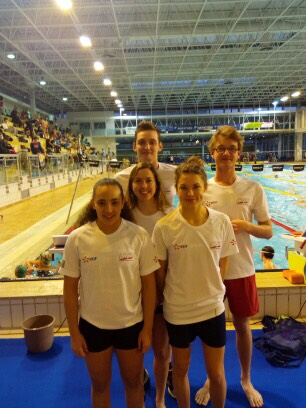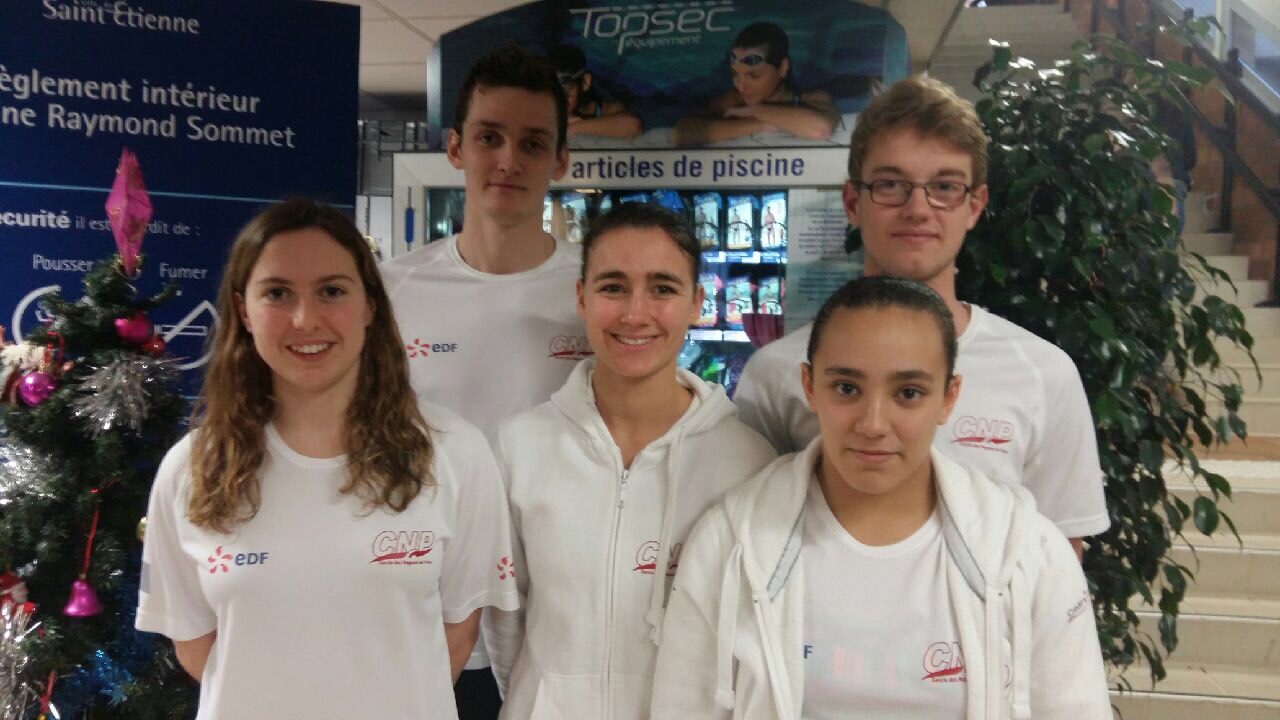 de natation à Saint-Etienne : Inès Elaoud, Margaux Haslé, Jeanne Lacour, Gabrielle Pelletier, Lucas Volle et Jérémy Granger.