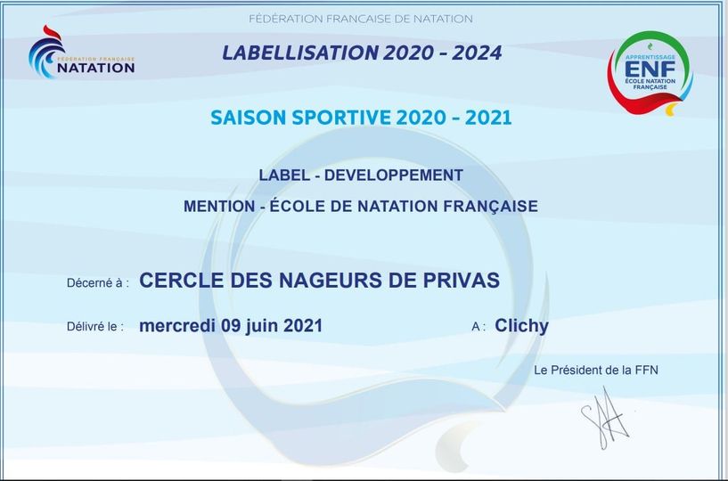 Notre Ecole de Natation vient d’être labellisée par la Fédération Française de Natation.